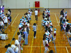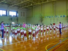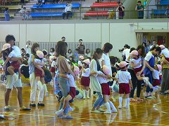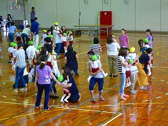 広い体育館で、お家の方と一緒にリズムあそびを楽しんだよ。
