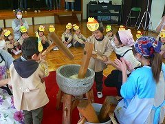 ヨイショ、ヨイショ、ヨイショー! ちからいっぱい おもちつき。